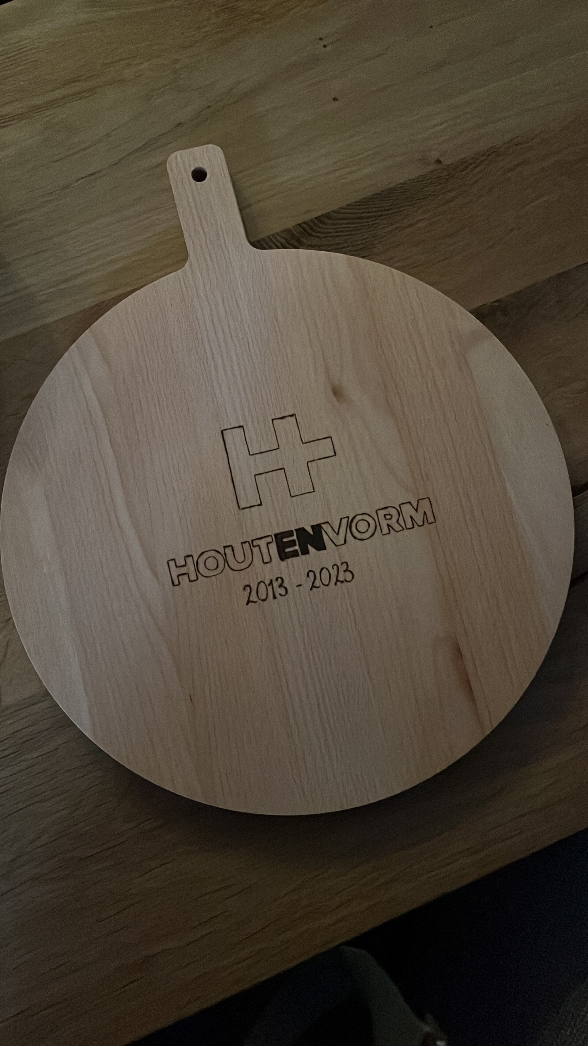 Deze houten borrelplank heeft een doorsnede van 30 centimeter. Je kunt kiezen voor een standaard tekst of er voor kiezen om de plank op maat te laten branden met bijvoorbeeld een logo of een tekst.